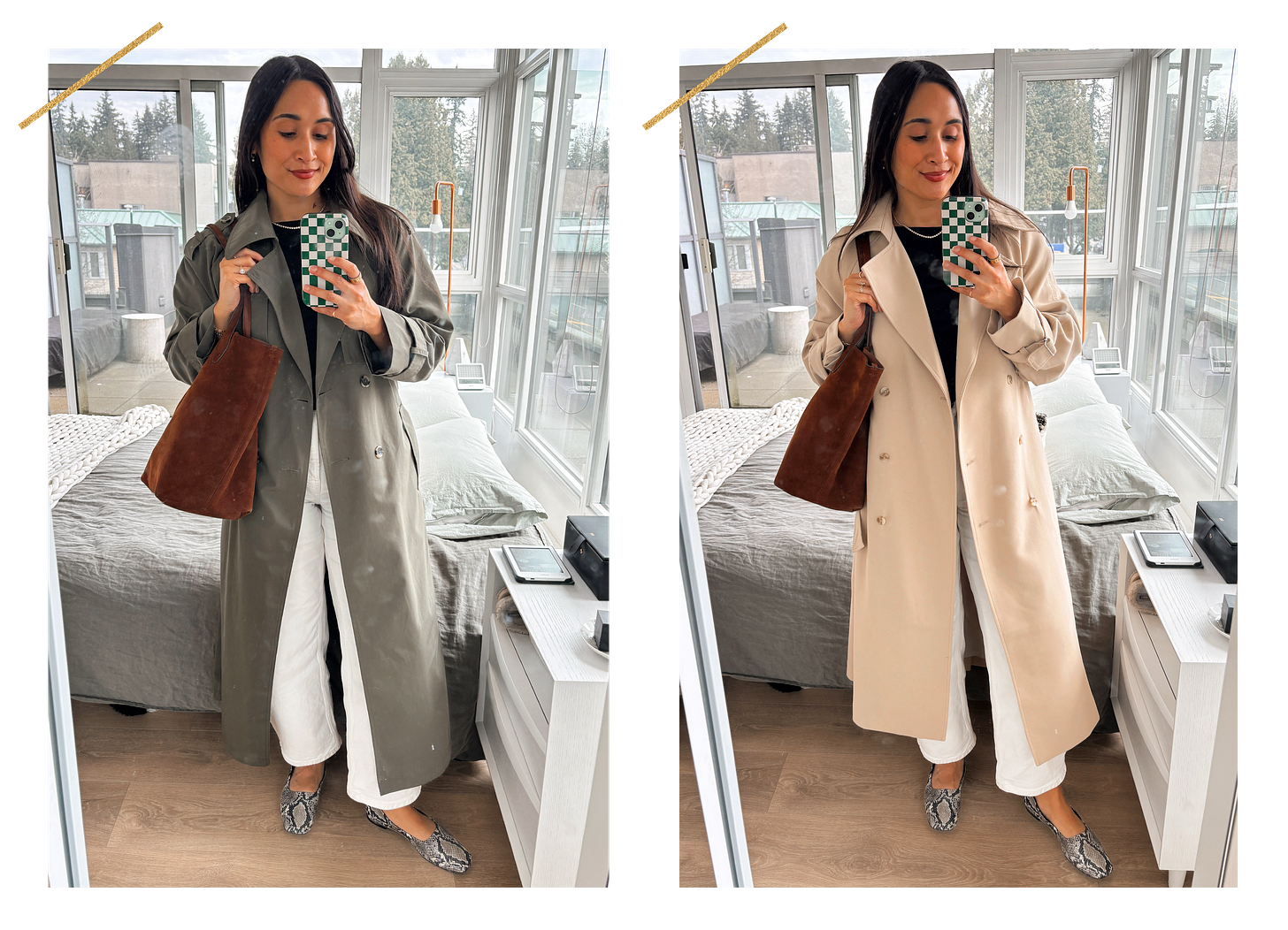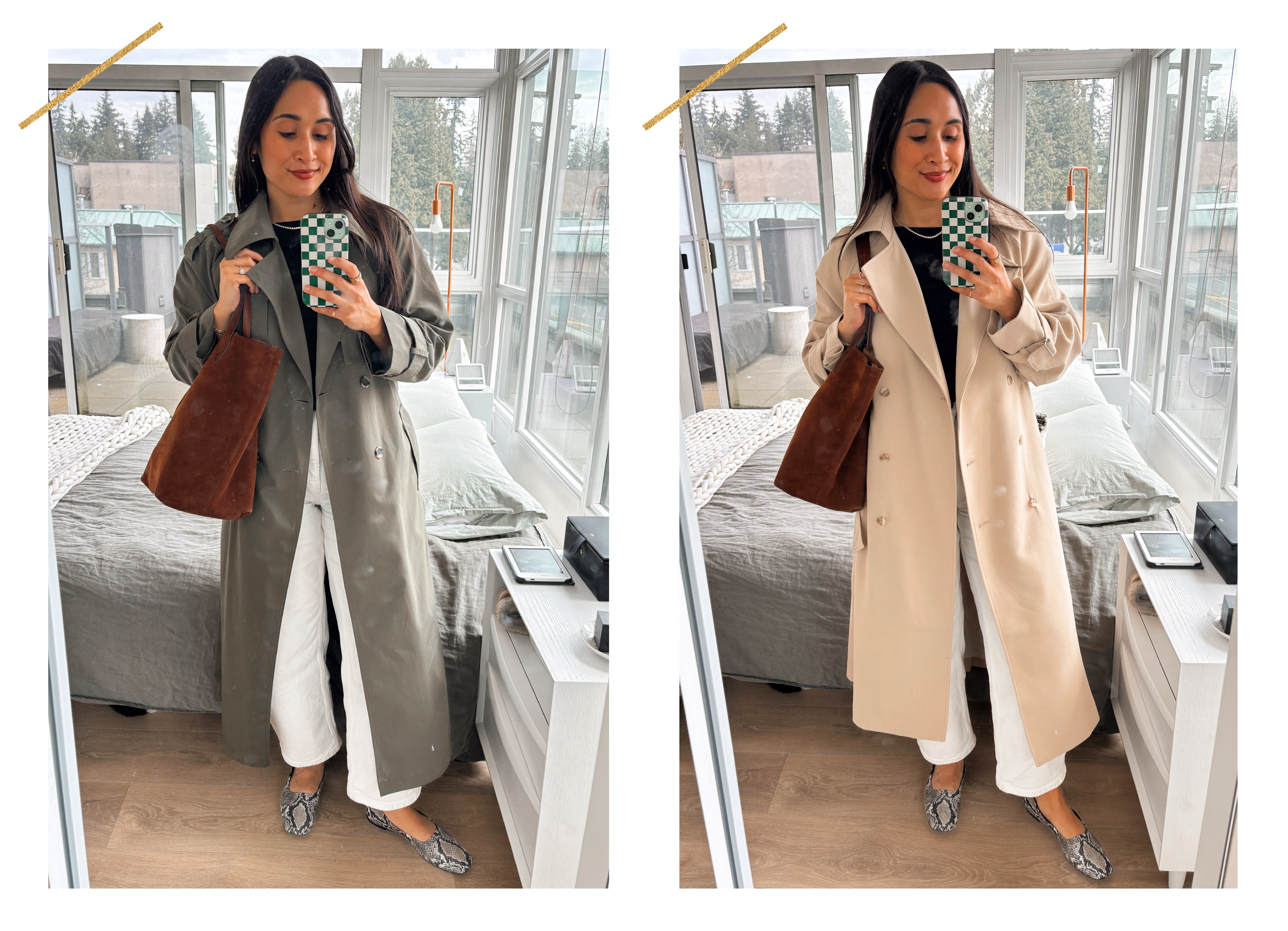In The Trenches: New in to my closet, just in time to wear on repeat all spring long, is this update on the classic trench. My previous trenchcoat had served me well for many years. But it felt a little too fitted for my taste which has eased away from the contoured silhouette that used to be in favor. This trench has a more relaxed silhouette and a beautiful drape. It sways! It swooshes! But it still feels tailored and polished. It is indeed oversized but after trying out both the XS and S, I opted for the small. Those extra inches make room for wearing this with both slimmer tees as well as bulkier knits. Versatility that felt important in a transitional piece like a trench. For added fun, I styled the same neutral base (tee, jeans, flats) with the two trenches in my closet including this green one that I call a “colorful neutral.”